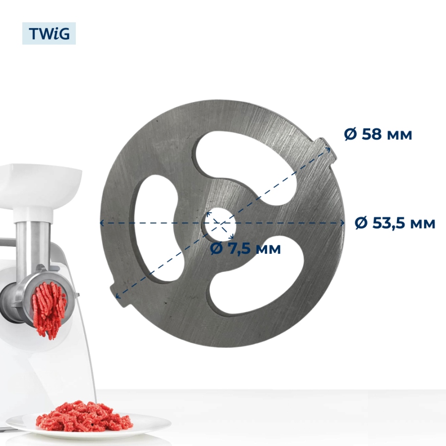 Изготовленная из высококачественной стали, решетка обладает прочностью и долговечностью. Диаметр решетки составляет 53,5 мм, а толщина 4 мм, что обеспечивает ее надежность при длительном использовании. Диаметр посадочного отверстия 7,5 мм позволяет точно и удобно установить решетку в мясорубку.