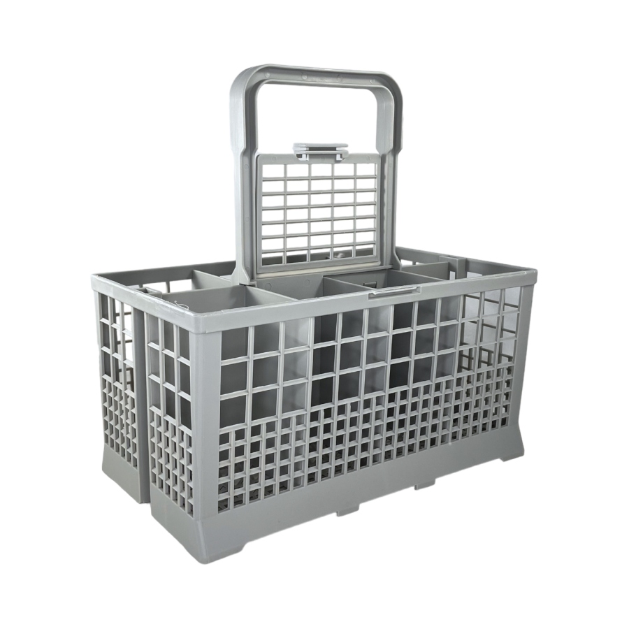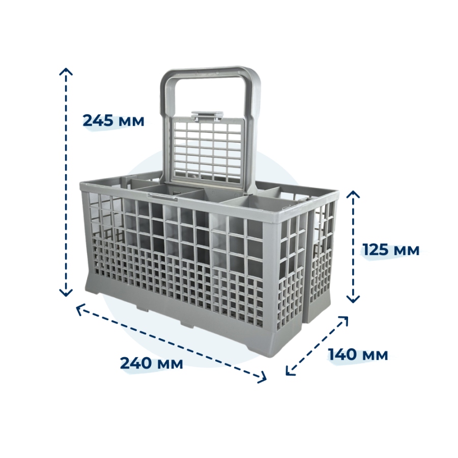 Корзина для мытья столовых приборов для посудомоечной машины Bosch 621320 имеет размеры 24 см длиной, 14 см шириной и высотой 12,5 см без ручки, а с учетом ручки - 24,5 см. Её ручка съемная, что облегчает загрузку и выгрузку приборов. Цвет пластика серый. Корзина спроектирована для эффективной укладки и мытья столовых приборов, обеспечивая оптимальное использование пространства внутри посудомоечной машины.