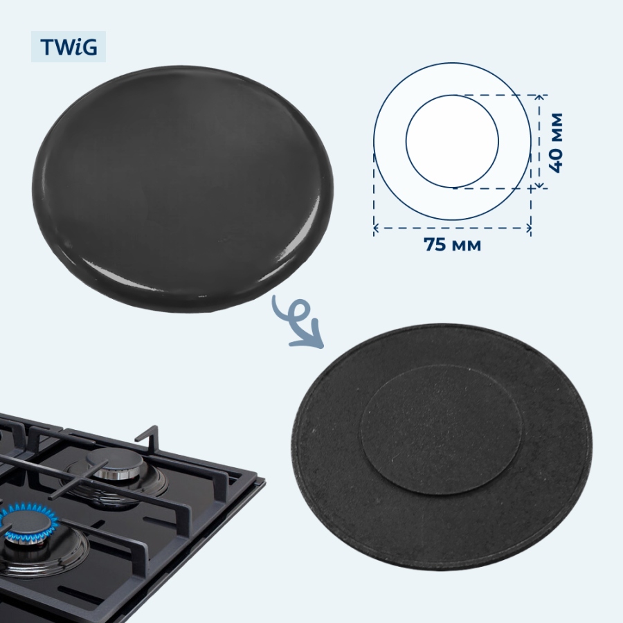 Крышка рассекателя средней конфорки для газовой плиты Midea имеет наружный диаметр 75 мм, внутренний диаметр 40 мм и толщину 3 мм. Изготовлена из металла, покрыта глянцевой эмалью.