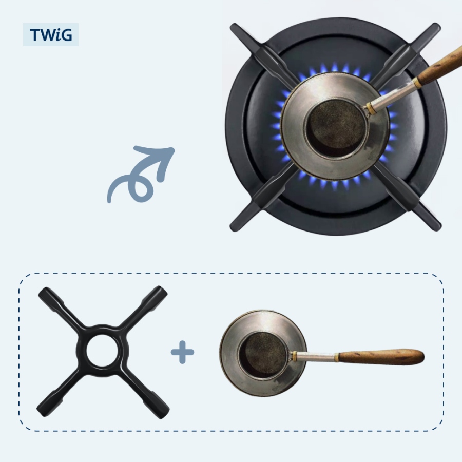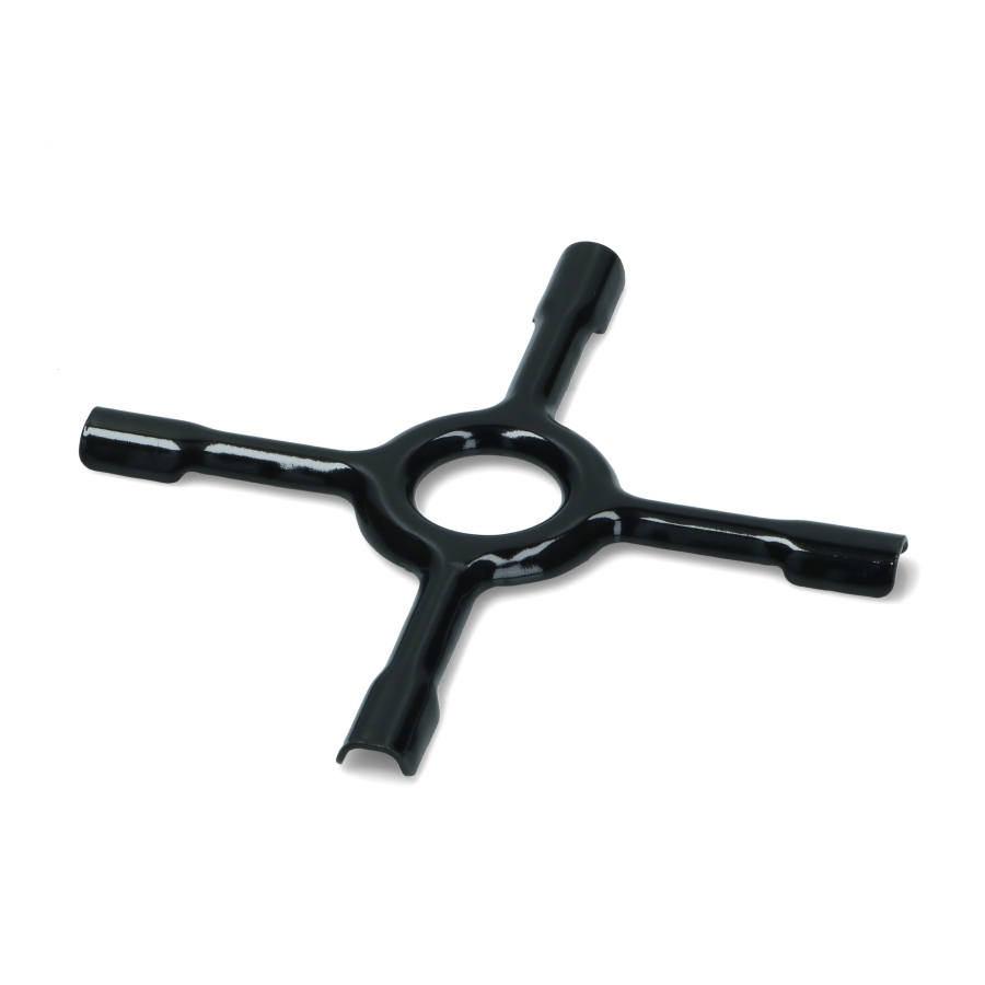 Накладка на решетку стола газовой плиты диаметром 130 мм решает проблему устойчивого размещения мелкой посуды на конфорке. Форма креста обеспечивает надежное удержание даже небольших ковшей и турок, предотвращая их скольжение и опрокидывание. Покрытие эмалированной краской не только придаёт накладке эстетичный вид, но и защищает её от коррозии.