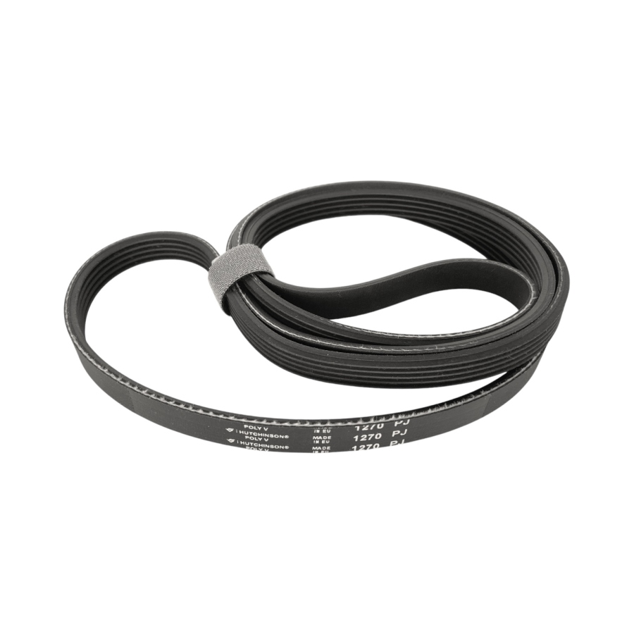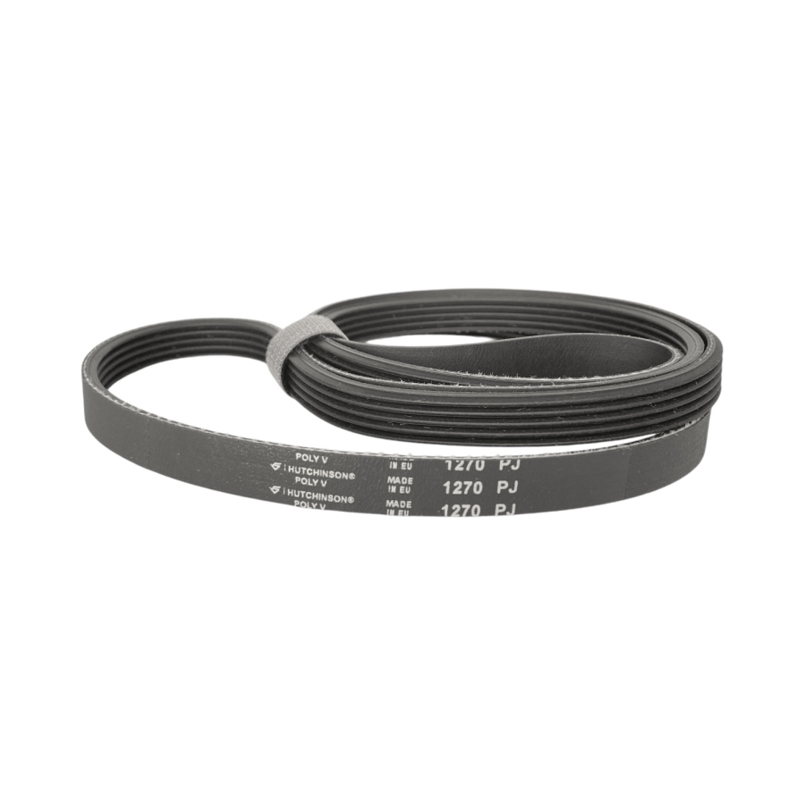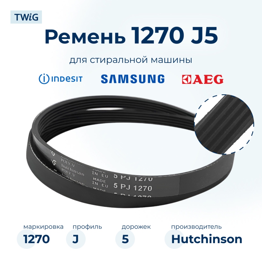 Ручейковый ремень для стиральной машины 1270 J5 Hutchinson предназначен для передачи вращательного момента от двигателя к барабану. Он оснащен профилем J5 с пятью дорожками, что обеспечивает надежное сцепление со шкивами и стабильную работу устройства. Длина ремня 1270 мм, что делает его совместимым с рядом моделей стиральных машин.