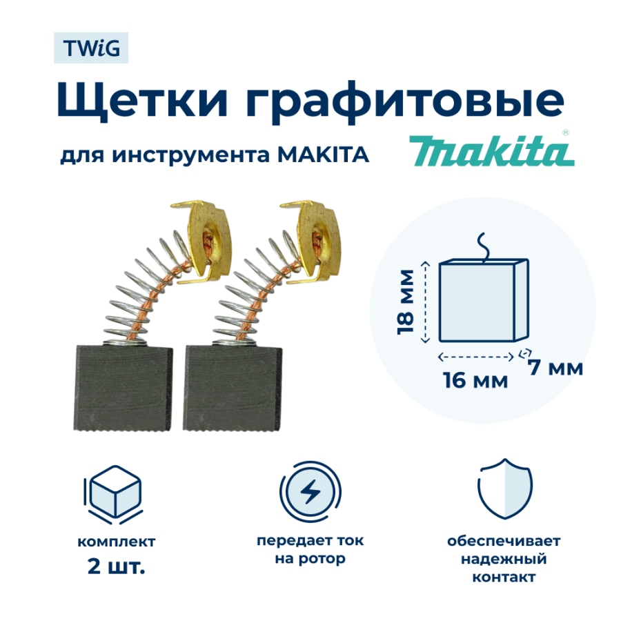 Щётки угольные для инструмента MAKITA с пружиной и клеммой, размер 7x18x16 мм, 2 штуки. Подходят для моделей Makita (арт. СВ-144). Обеспечивают правильное функционирование электродвигателя и автоматически отключаются при износе благодаря специальной пружине с керамическим наконечником.