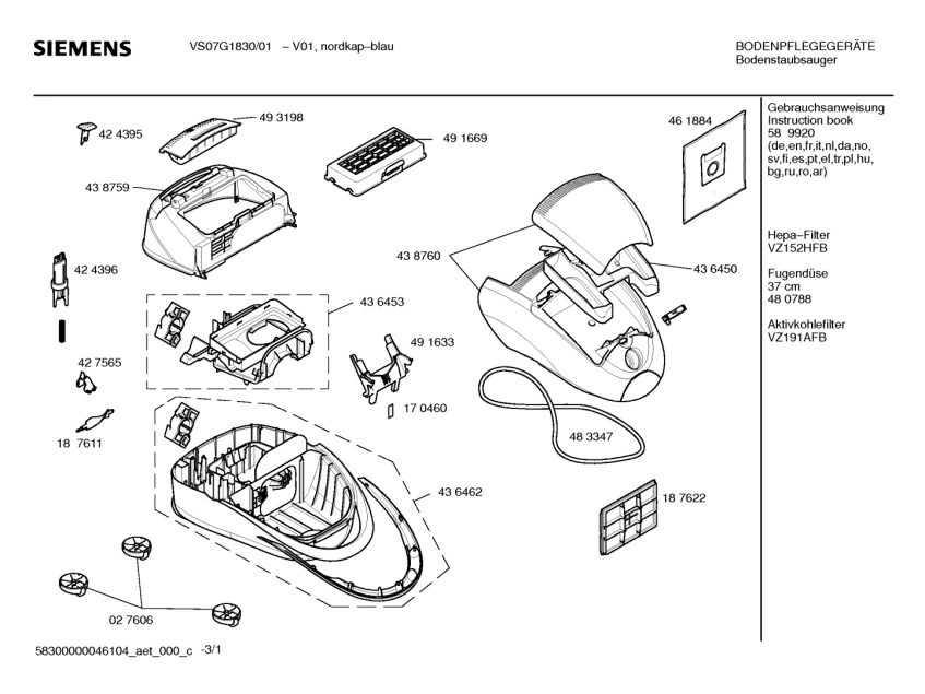 Запчасти для пылесоса Siemens VS07G1830/01 (58300000046104_aet_000_c_01)